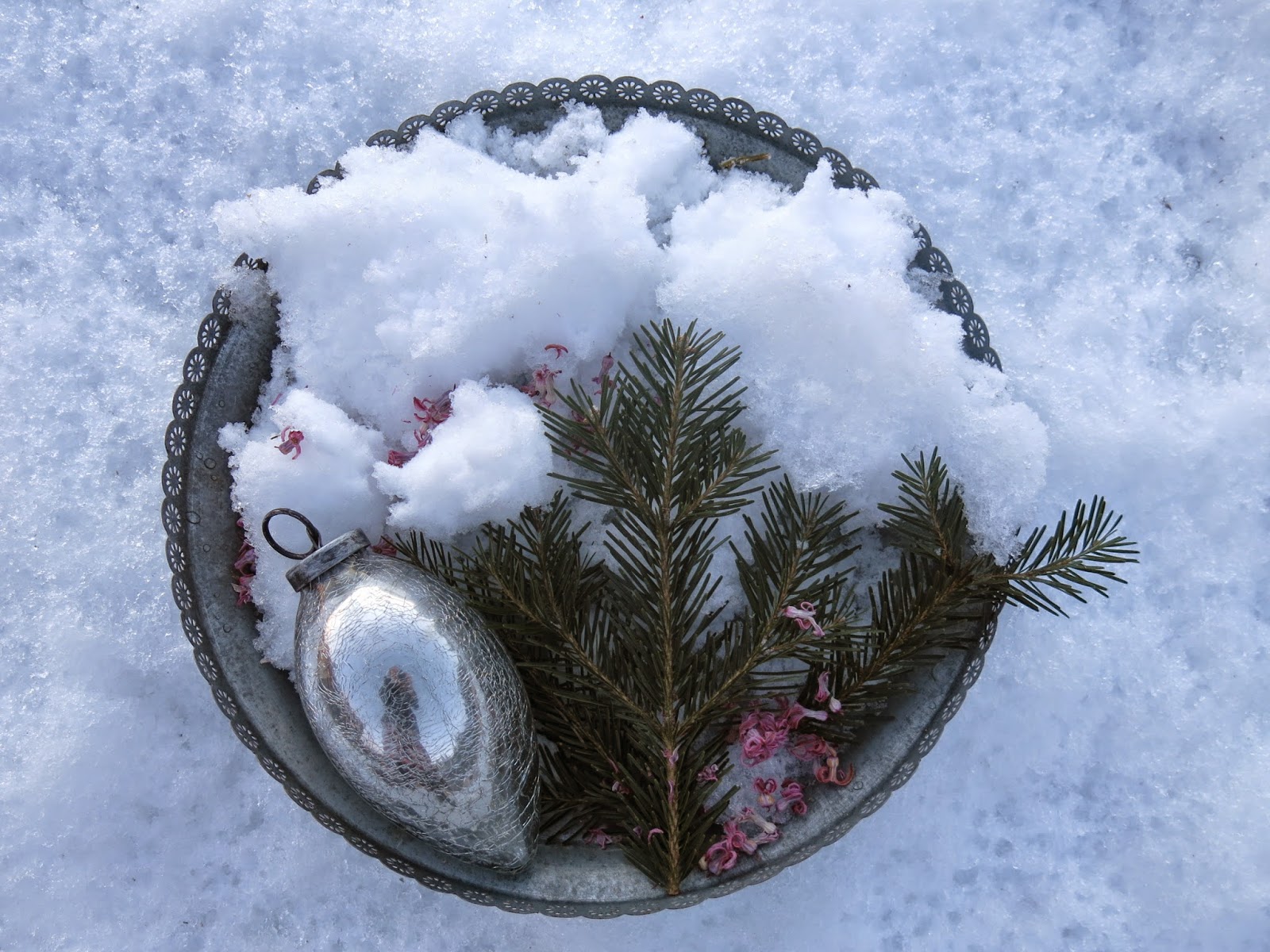 Snön ligger över det mesta i såväl natur som trädgård. Plantor sover under granristäcke. Rosa hyacintblommor. Silverkula istället för silvermånen som syns ibland.
